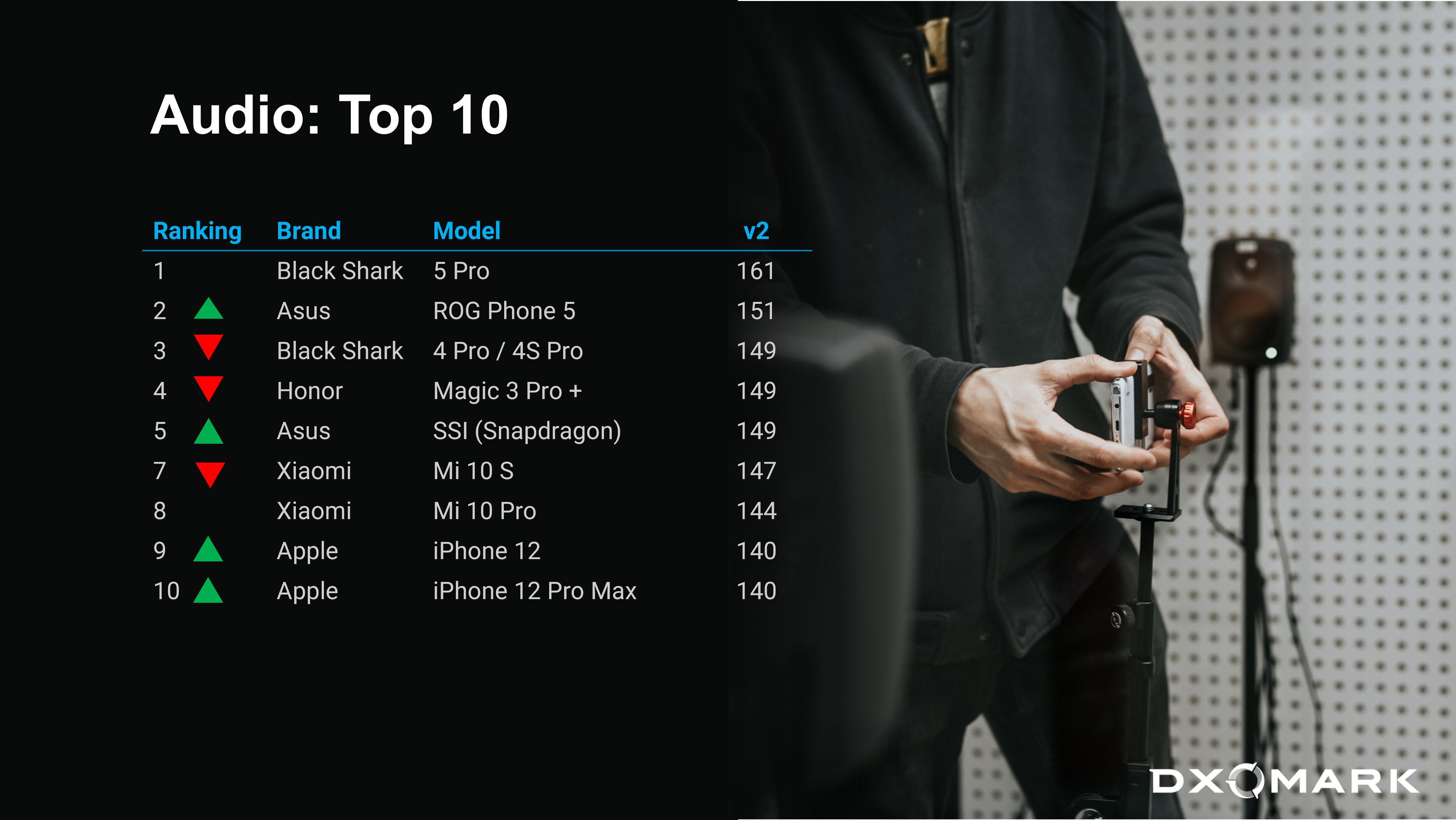 In the updated audio ranking, the Black Shark 5 Pro remains the king in every way. It performs especially well in the new wind noise evaluation. Asus and Google devices move up in the ranking, thanks to overall good performance, so does the iPhone 13 Pro Max, thanks to a great audio zoom feature. The Samsung Galaxy S22 Ultra provides excellent wind noise reduction and therefore gains some spots in the ranking as well.